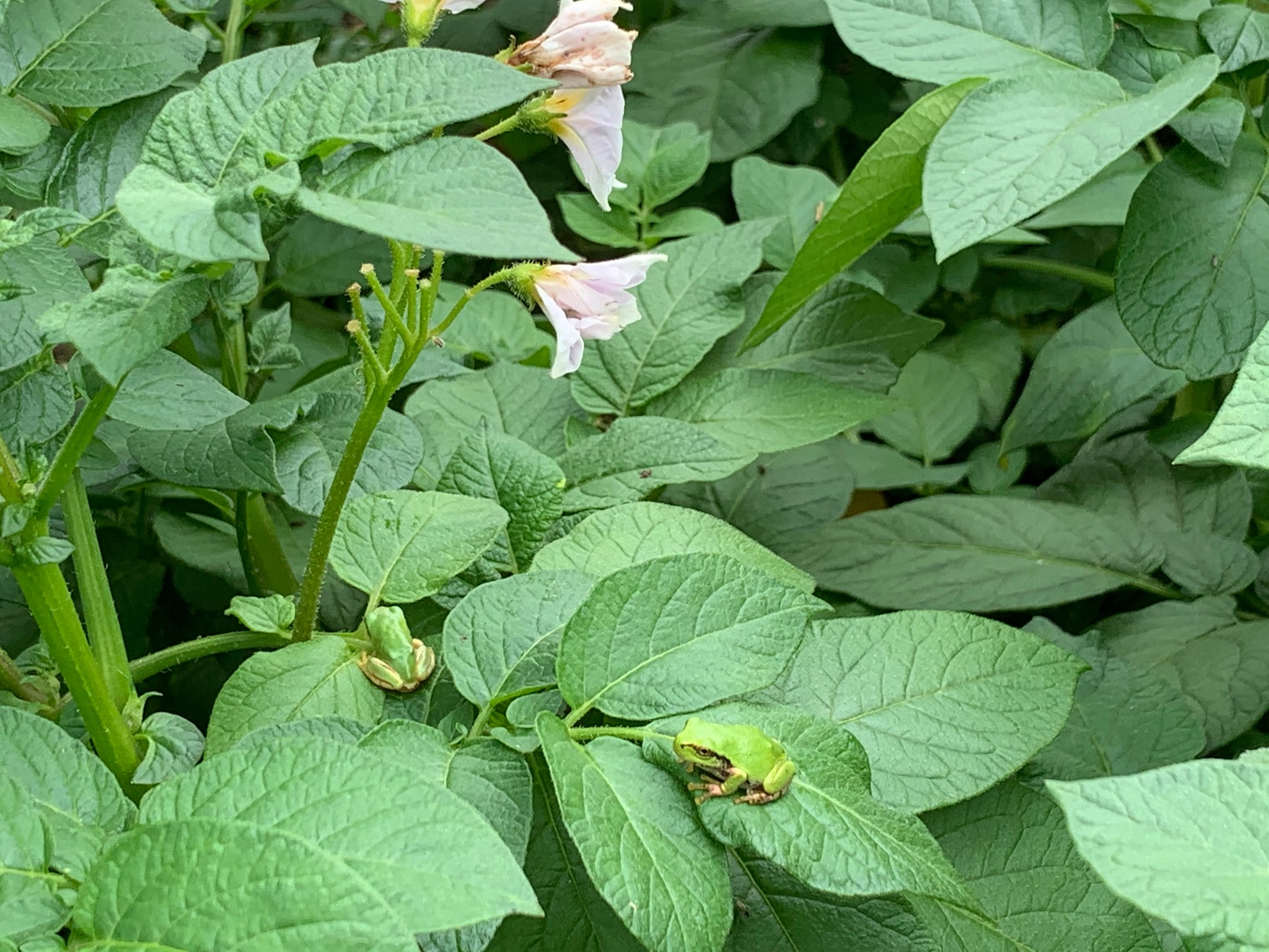 ▲ジャガイモの葉に乗っているカエル