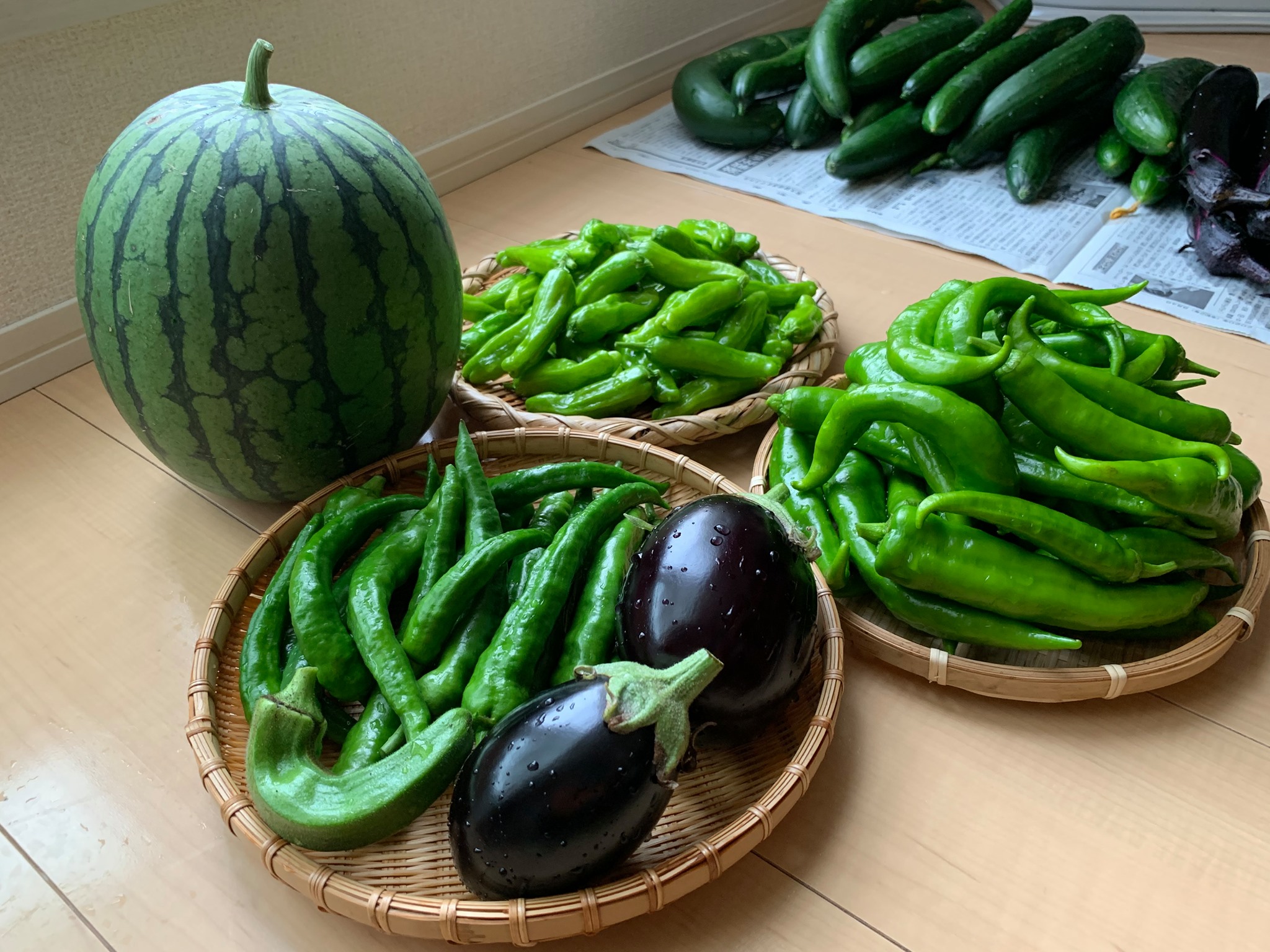 小玉スイカも育ててみたのですが、賢いカラスが美味しくなるのを狙っていることに気付き、カゴをかぶせて見えなくすることで、無事に収穫することができたのも楽しい経験です。