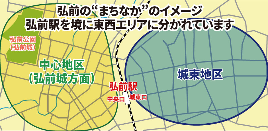 ▲弘前駅西側が、城下町の頃から続く昔ながらの市街地。東側は、ここ半世紀で発展してきたエリアです