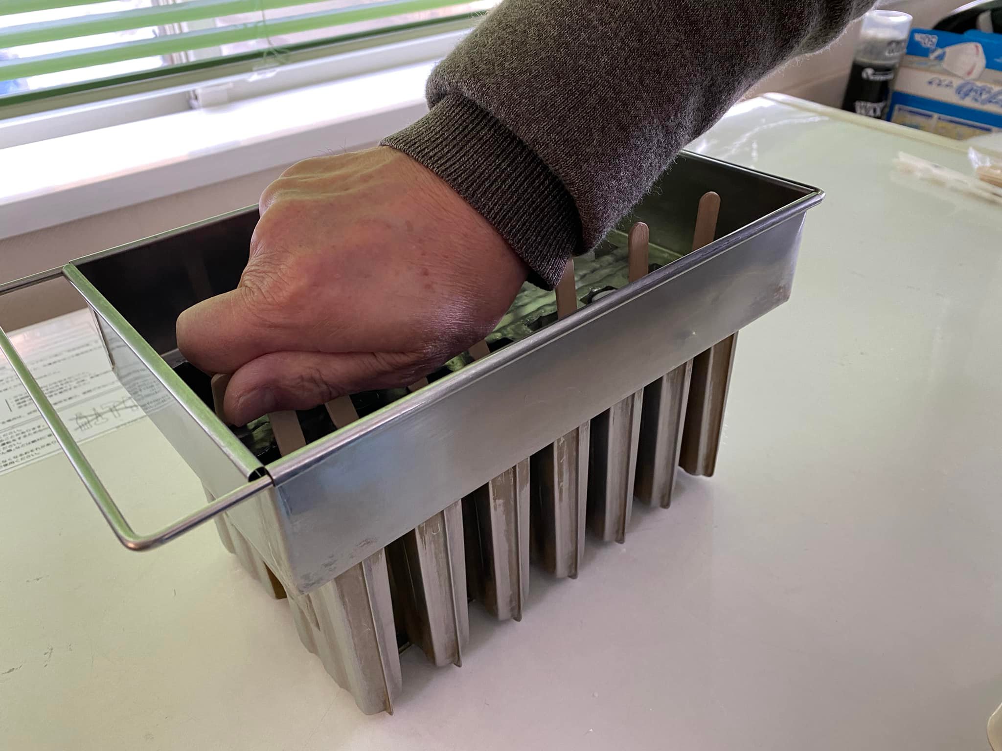 ――電気冷蔵庫が普及してアイスの人気が急上昇した頃、たくさんの人に数多くアイスを届けたいと検討してたどり着いた方法です。それまでは棒を1本ずつガイドの穴に通し立てていましたが、ガイドを使わず棒を2本クロスして置くように変更したところ、アイスを型から抜く時は指の間に棒を引っ掛けて一気に4〜6本抜くことができて作業の効率が上がりました。そして、現在でもこの方法でアイスキャンディを手作りで製造しています。
