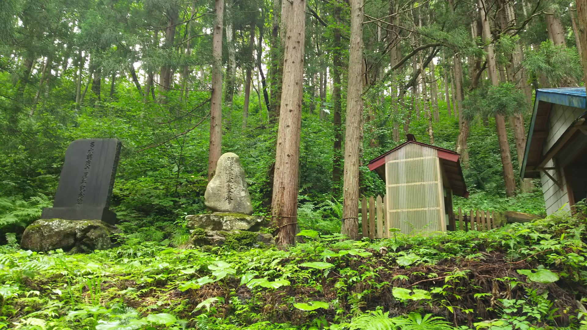 ▲御茶水の駐車場から建物を望む。青い屋根の建物は休憩所として開放。休憩所の手前が取水場です。駐車場から近いので運びやすい。建物までの坂道は滑り止めの石があります
