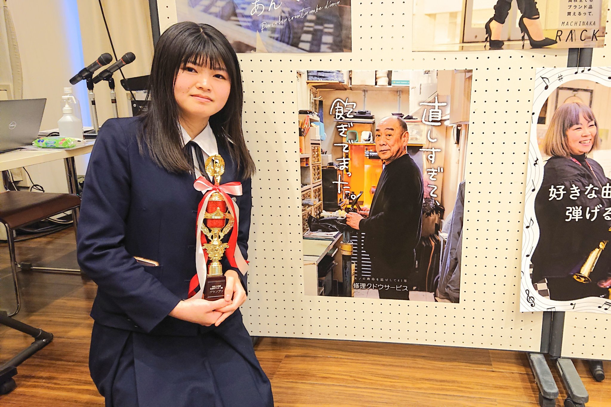学校に告知ポスターが貼ってあって、面白そうだなと参加してみたんですが、思っていた以上に楽しかったです。自分の担当のお店しか行ってないんですけど、取材に行って、お話をいっぱい聞いたりしたときに、「弘前って面白いんだな」ってことに気付きました。実際撮影するときも、体勢変えたりして大変だったんですが、最終的にはいいものになったし、こうした賞を取れたことはとてもうれしいです。