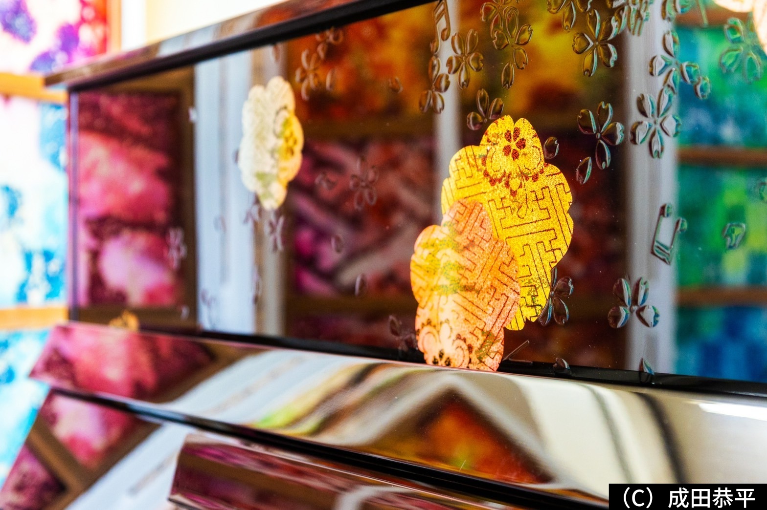 Q.ピアノには、よく見る津軽塗とは違ったデザインが施されていますね?