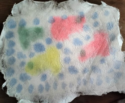 最初に体験したのは「紙漉き」。水に溶かした和紙の原料を、網を張った四角い木枠ですくいます。揺すりながら全体に原料を広げ、排水機で水分を抜いたら絵の具で好きな模様を描きます。もう一度、排水機で水分を抜き、アイロンをかけて20分ほど乾燥させたら完成です。