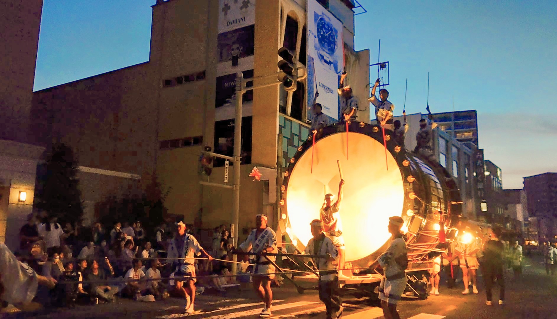18時を過ぎると、桜大通りから祭囃子の音色が響いてきます。運行の始まりを告げる音色に、観客席からは「わぁ!」という声が。遠くから聞こえる重低音に、会場は熱気に包まれていきます。