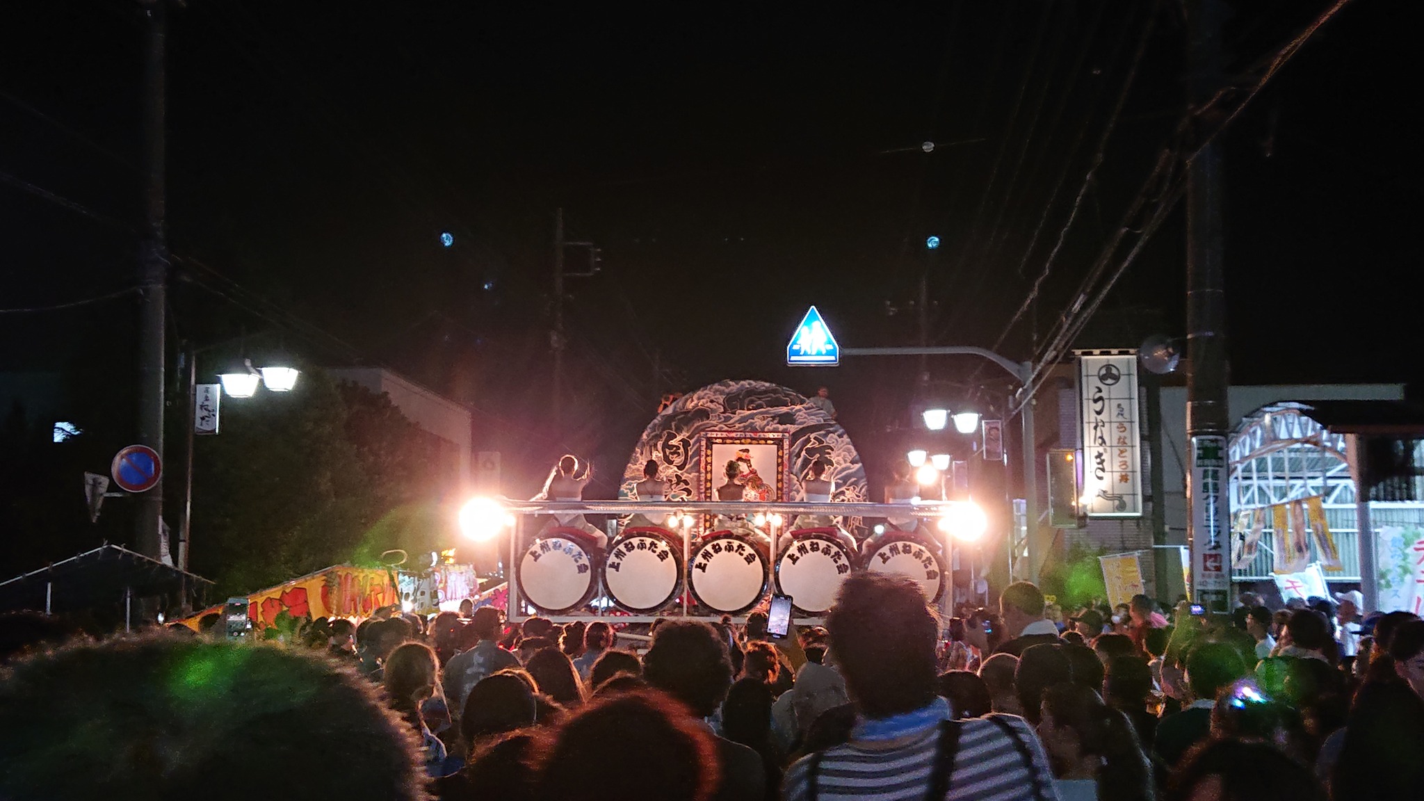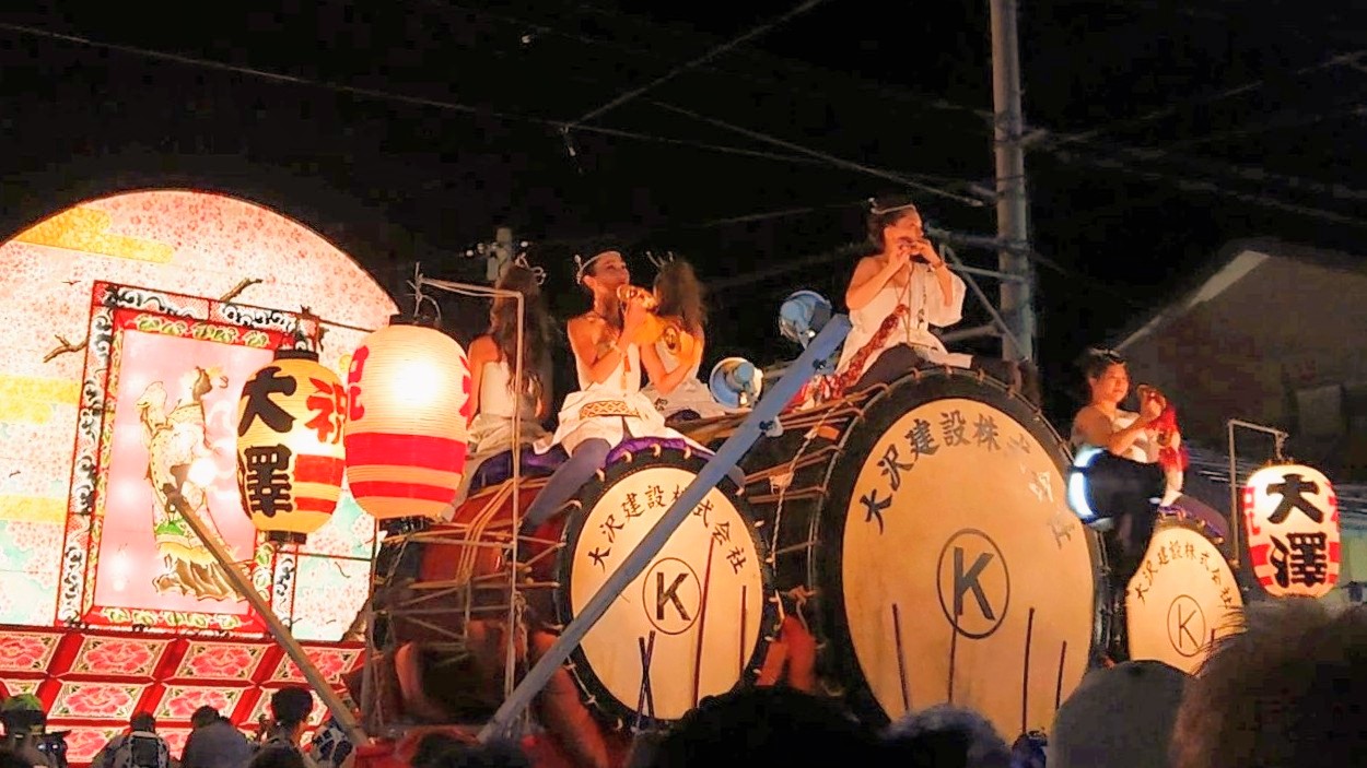 尾島ねぷたまつりを初めて見て特に驚いたのは、囃子方に女性が多いことでした。弘前ねぷたまつりでも女性の囃子方はいますが、男性が多いイメージがあります。尾島ねぷたまつりでは太鼓の上に乗って囃子を演奏する光景が定着しており、上に乗るのはほとんどが女性。年齢層が非常に若いことがとても印象的でした。