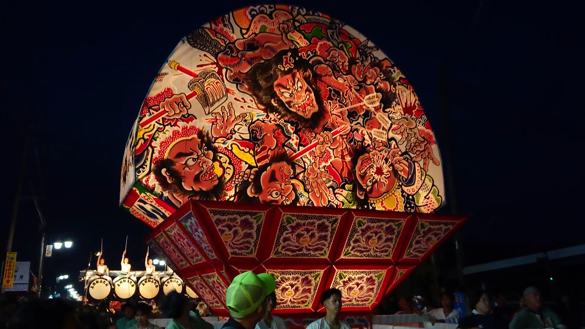 尾島ねぷたまつりの見どころの一つとして、大太鼓は欠かせません。大きさはなんと直径約3メートル! 迫力ある太鼓から奏でられる力強い音色に、観客の目もキラキラしています。
