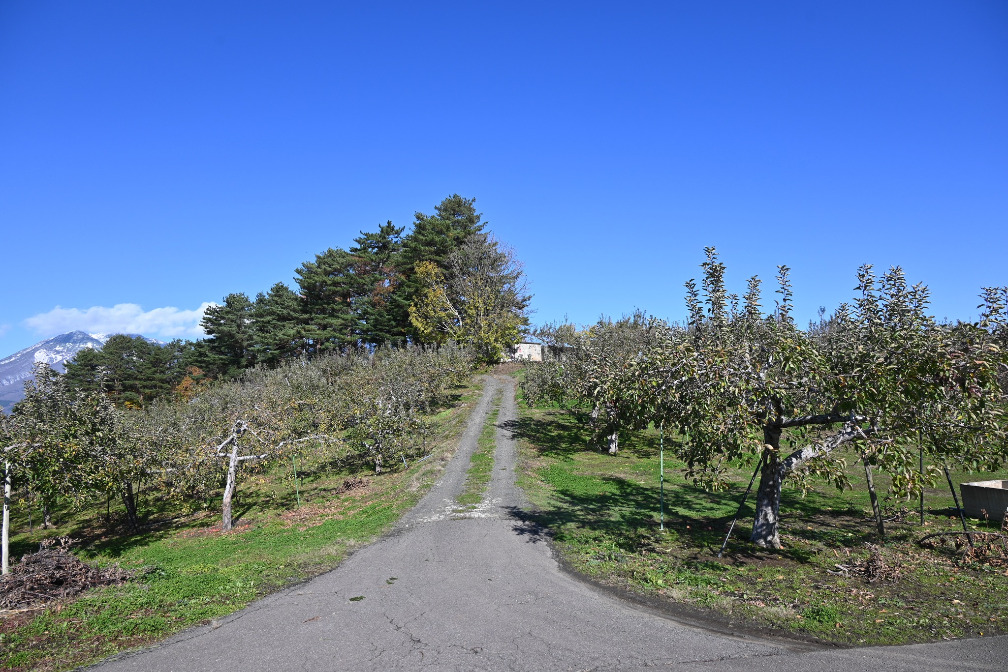 「山のたまり場 夢想館(むそうかん)」という公共施設の前の道を、西へ300メートルほど進み、右手に見える丘の頂上、りんご園の細い道の先に「大石明神」はあります。