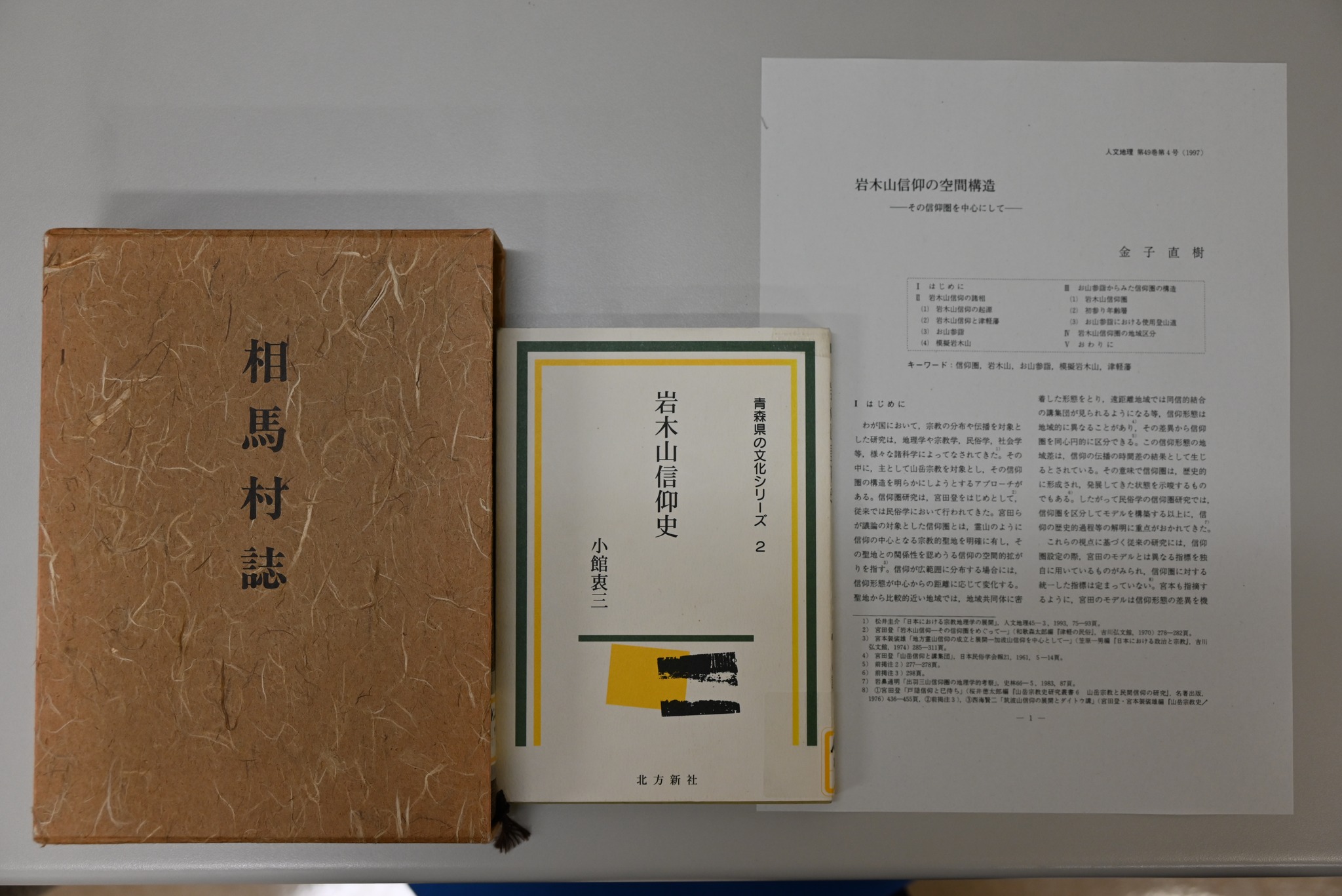 ▲参考文献:(左)鳴海恒男『相馬村史』、(中)小館衷三『岩木山信仰史』(右)金子直樹「岩木山信仰の空間構造―その信仰圏を中心にして」