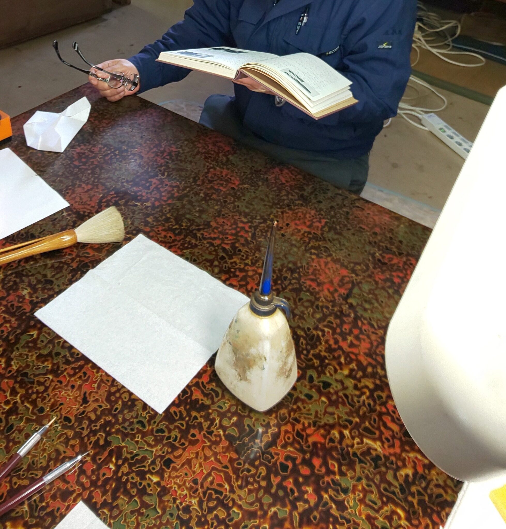 座卓の修理を指導した、先輩社員でありベテランの職人さんは、津軽塗の漆の厚さに大変驚いていました。
