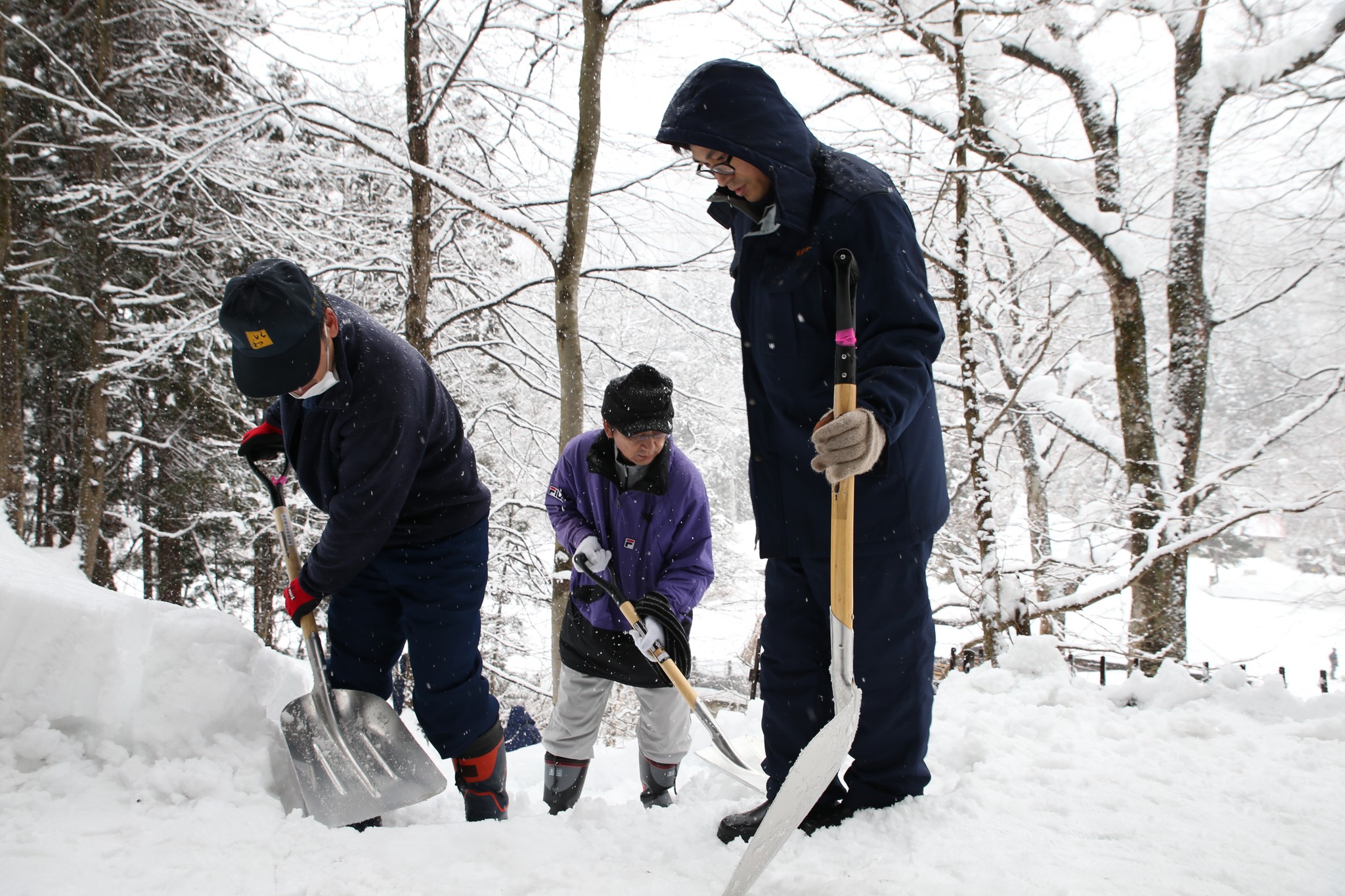 鳥居までたどり着くと、今度は参道の除雪が始まります。参拝客が岩屋堂まで登れるように、丁寧に除雪し、踏み固めていきます。