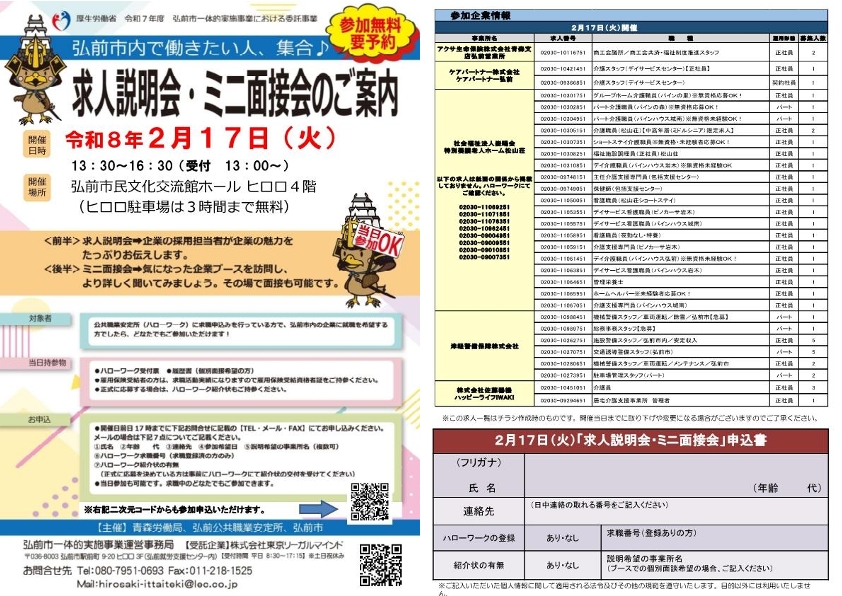 青森労働局、ハローワーク弘前、市(商工労政課、ひろさき生活・仕事応援センター)主催による、求人説明会を開催します。
