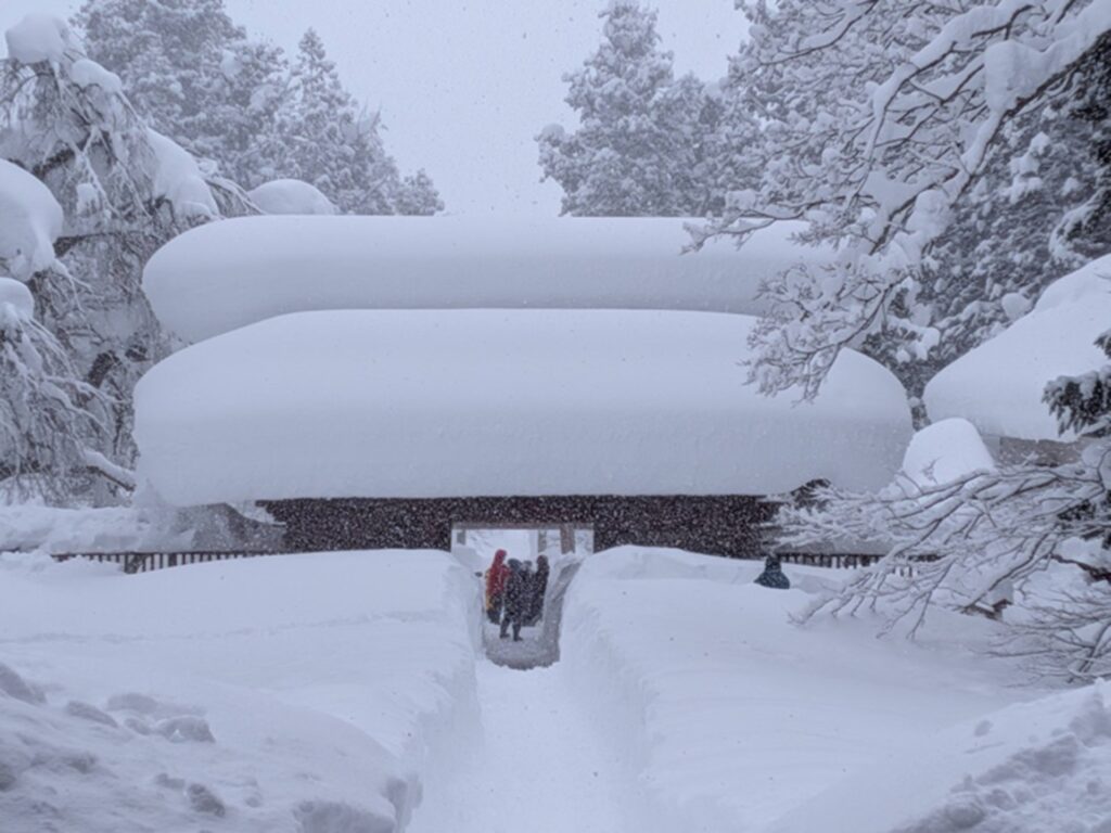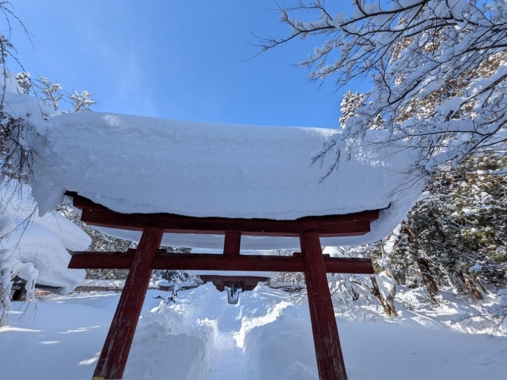 作業としては8時から11時くらいまで3時間ほどやりましたが、境内の除雪はまったく終わりません。地域の人たちは午後からも雪かきをするということでした(のちの報道によると、大雪のため立ち入り禁止となりました。行く際はご注意ください)。