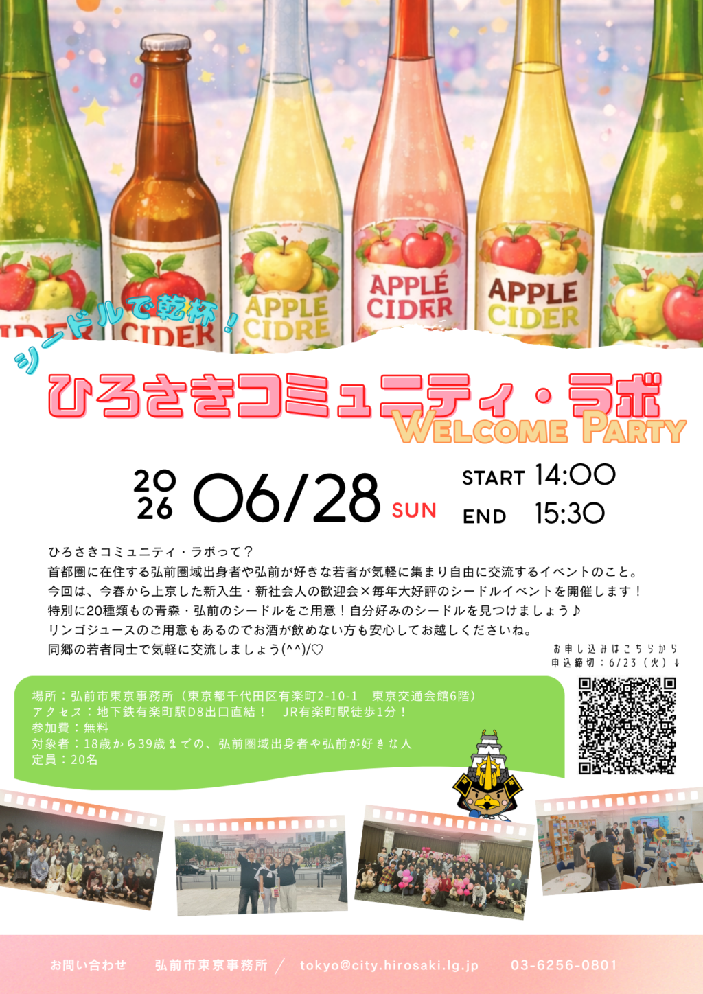 首都圏に在住する同郷の若者や、青森・弘前に興味がある若者同士で交流できる機会となりますので地元が恋しい方、津軽弁を話したい方、同郷のお仲間を見つけたい方、新天地で不安を抱えている方、シードルに興味がある方も、ぜひ皆さまお誘い合わせの上ご参加ください(^^)/♡
