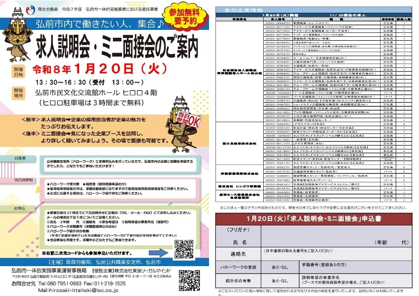 青森労働局、ハローワーク弘前、市(商工労政課、ひろさき生活・仕事応援センター)主催による、求人説明会を開催します。 市内企業の...